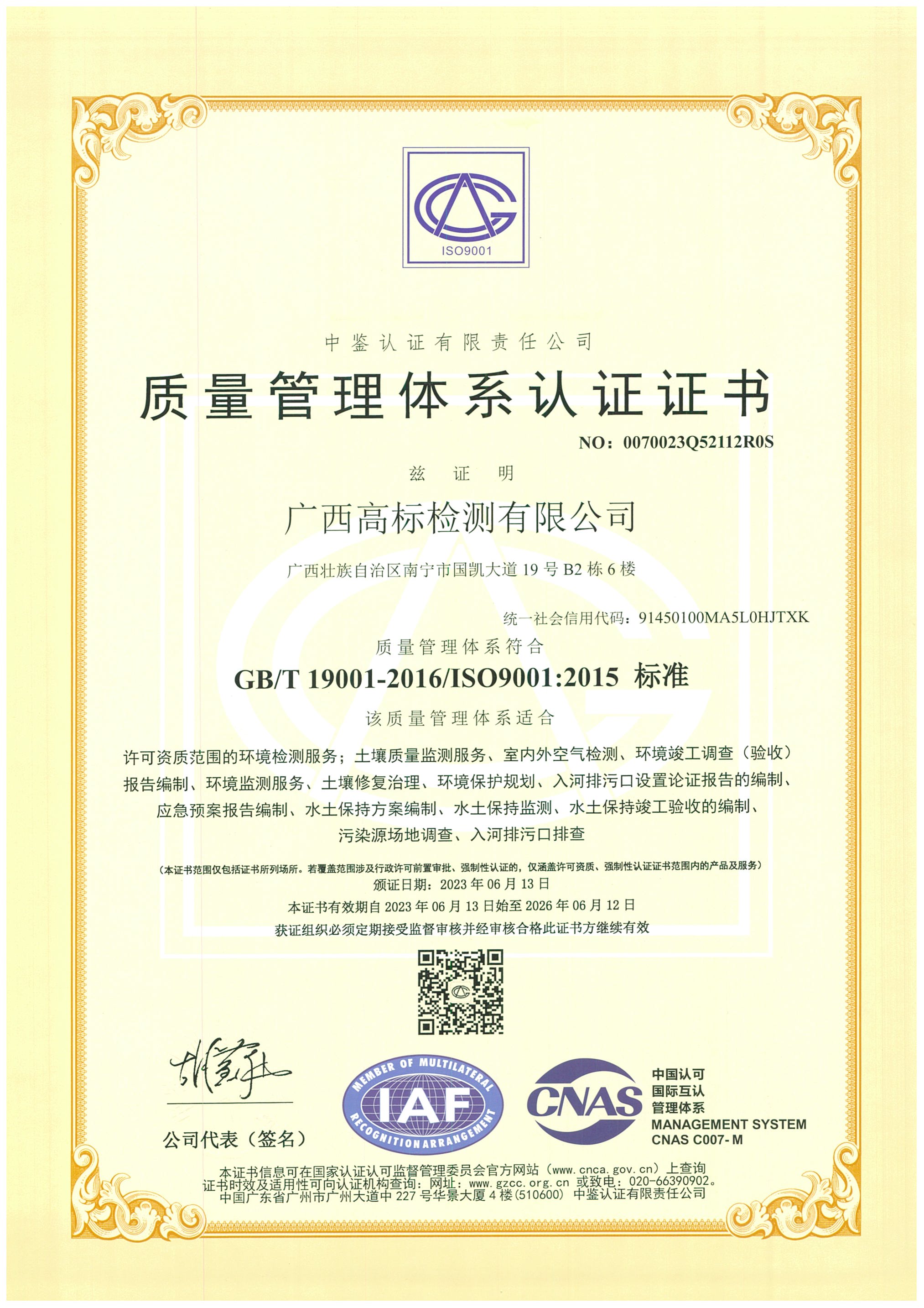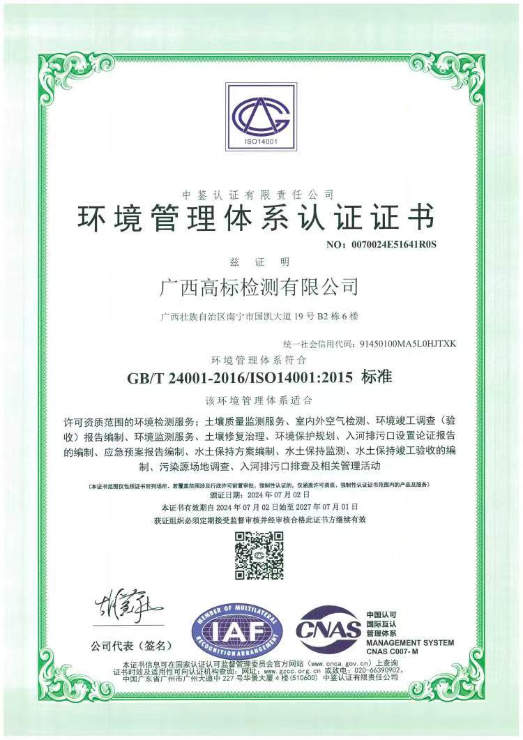 环境管理体系认证证书