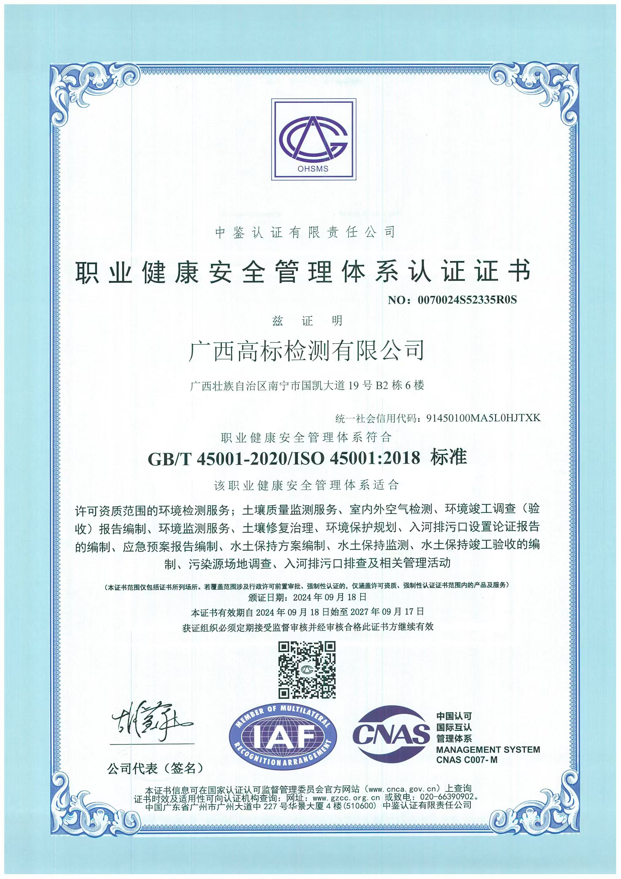 职业健康安全管理体系认证证书
